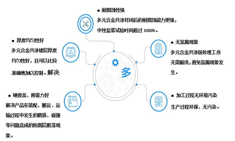 多元合金共滲防腐技術是一種熱擴散表面強化技術,它是利用加熱狀態下將鋅、鋁以及稀有元素鑭等多種金屬元素擴散進入鋼鐵構件表面,制備成合金保護層的一種化學熱處理工藝。